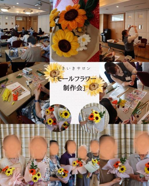 8月6日(水)館内大ホールにて、生活サービス部のスタッフによる「モールフラワー制作会」を開催しました。カラフルなモールを使った手作りの花は、ふわふわとした質感で可愛らしい見た目のひまわりの花束でした。 ご参加された皆さま、スタッフの会話もはずんだ雰囲気の中で楽しい制作となりました!!